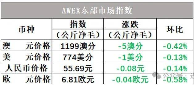 以澳元计价的 EMI(东部市场价格指数)本周收于1199澳分/公斤(净重),较上周下跌0.42%(或下跌5澳分)。