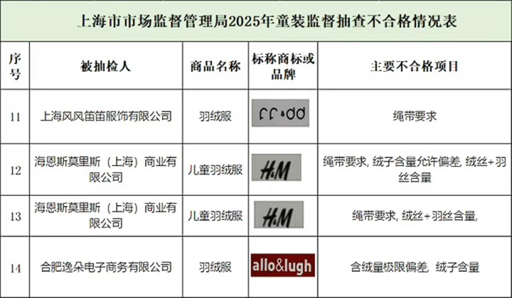 其中,有2批次是海恩斯莫里斯(上海)商业有限公司销售的标称由其生产(或供货)的 H&M 牌儿童羽绒服。其1批次的绒子含量偏差实测为-6.2%(标准值应≥-5.0%)、绒丝+羽丝含量实测为15.5%(标准值应≤10.0%),与标准要求不符。