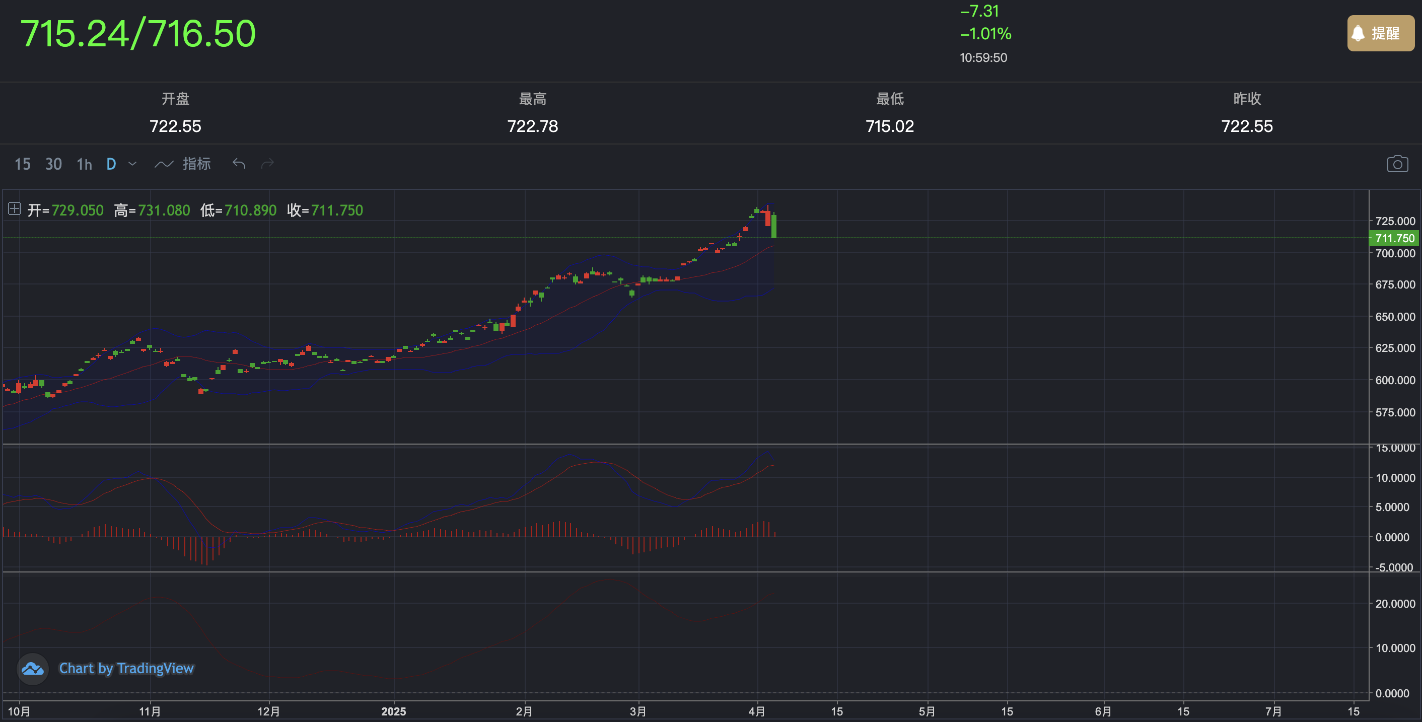 操作上需留意中轨的706支撑,一旦价格接近该位即可多头介入,上方压力位在720.6,再次触及该位即可参与做空,下方看打710元附近。