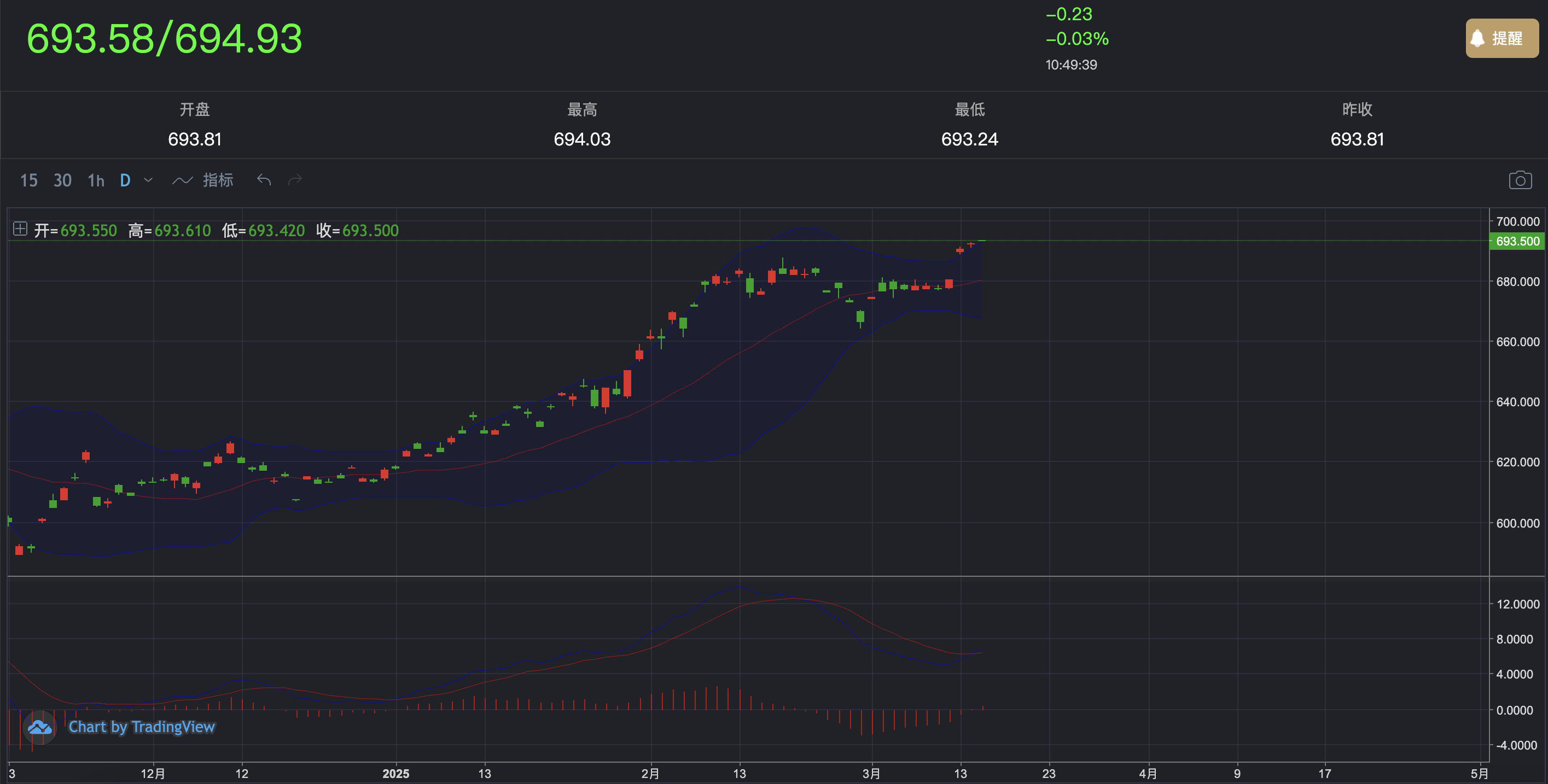 短期上方压力关注整数关口700附近,下方支撑则留意布林带中轨及680~690区间;短期若能放量突破关键阻力,则上行空间或进一步打开,否则应警惕震荡回调行情,最低看至680即可。