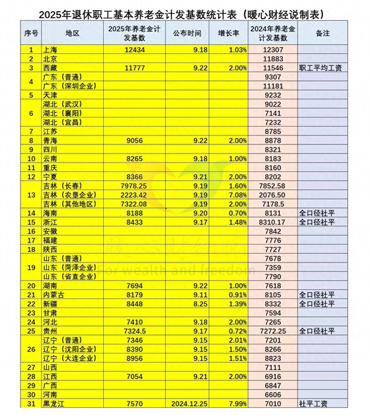 比如说上海市由12307元提升至12434元,西藏自治区由11546元提升至11777元,青海省由8878元提升至9056元。今年的养老金计发基数普遍提升1%~2%,不过海南省比较低,只有0.7%。不过黑龙江省的增长率是7.99%,但这是去年做出的,今年预计也会降低。