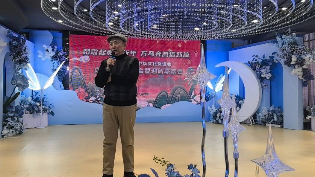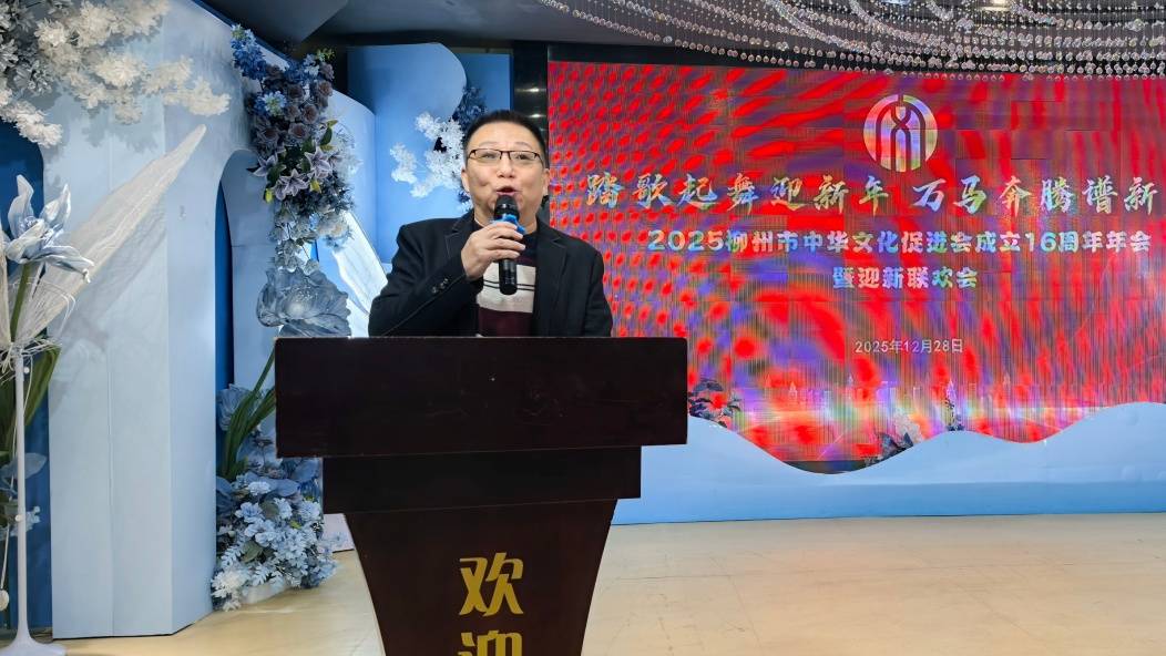 年会在欢乐祥和的气氛中拉开序幕。广西中华文化促进会副主席、柳州市文促会主席赵建华首先作年度工作报告。他回顾过去一年时感慨道:“小龙依依不舍,金蹄奔腾而来。转眼间,文促会已走过十六载春秋。我们携手跨过坎坷,始终快乐前行;如今歌飞新征途,喜迎国家‘十五五’宏伟蓝图。”