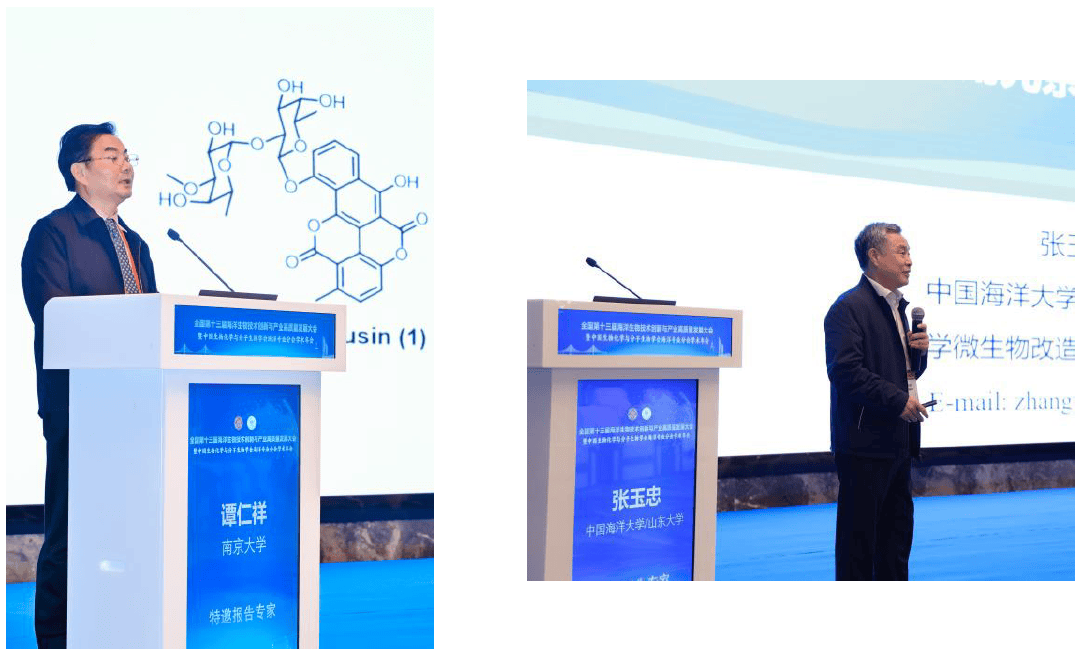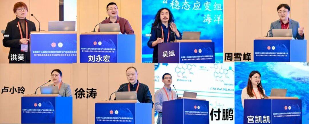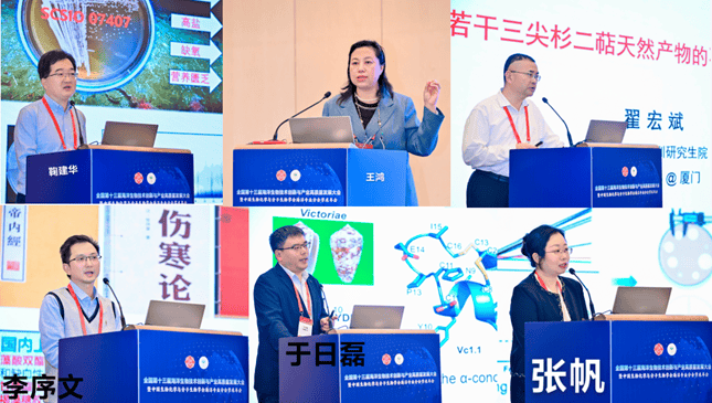 在海洋生物医药创新论坛模块上,来自山东大学的鞠建华教授、浙江工业大学的王鸿教授、北京大学的翟宏斌教授、中国科学院上海药物研究所的李序文研究员、中国海洋大学的于日磊教授、武汉大学的张帆教授、武汉大学的洪葵教授、中国科学院南海海洋研究所的刘永宏研究员、浙江大学的吴斌教授、中国科学院南海海洋研究所的周雪峰研究员、中国海军军医大学的卢小玲教授、中国海洋大学的徐涛教授、中国海洋大学的付鹏教授、滨州医学院的宫凯凯教授等14位专家在党永军教授、朱伟明研究员、高程海教授等7位主持人的主持下,分别分享了在此领域的主题报告。